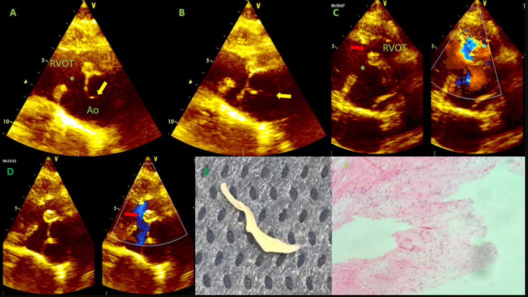 Figure 2: 26-year-old adult with unrepaired tetralogy of fallot, who underwent surgical repair and simultaneous resection of LEx in aortic valve (see below). 2A: Short axis view of the aortic valve in systole (AO). Ventricular septal defect (*) is observed that extends to the Right Ventricular Outflow Tract (RVOT). Yellow arrow shows LEx (fine filaments) that extend over the edge of the right aortic leaflet. 2B: The same in A, dyastole (closed Ao). 2C: Short axis comparative mode color in systole wit focus on RVOT. Red arrow shows the hyperrophic infundibular septum, displaced anterior and right in RVOT. At this point there is an obstruction. 2D: The same view in D, the red arrow shows blood in diastole causing shear stress on the aortic valve, which is a described cause of the wear process and the development of Lex. 2E: Gross anatomic specimen of the LEx removed during surgical repair of CHD. 2F: microscopic examination of the tissue with hematoxylin eosin staining revealed that the structure consisted of focally hyalinized dense connective tissue with little inflammatory infiltrate.