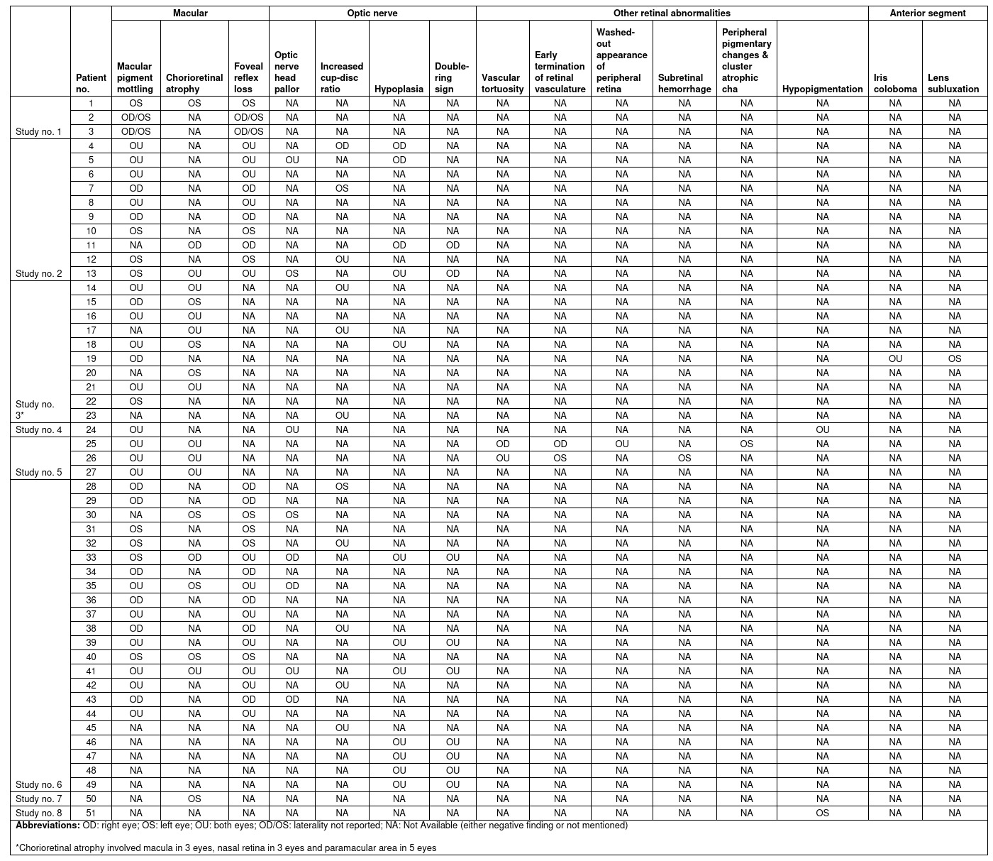 Anterior segment: An infant with bilateral iris coloboma and lens subluxation of left eye was reported in study no.3 by Freitas et al. [11] The remaining 7 studies did not report abnormal features in anterior segment.